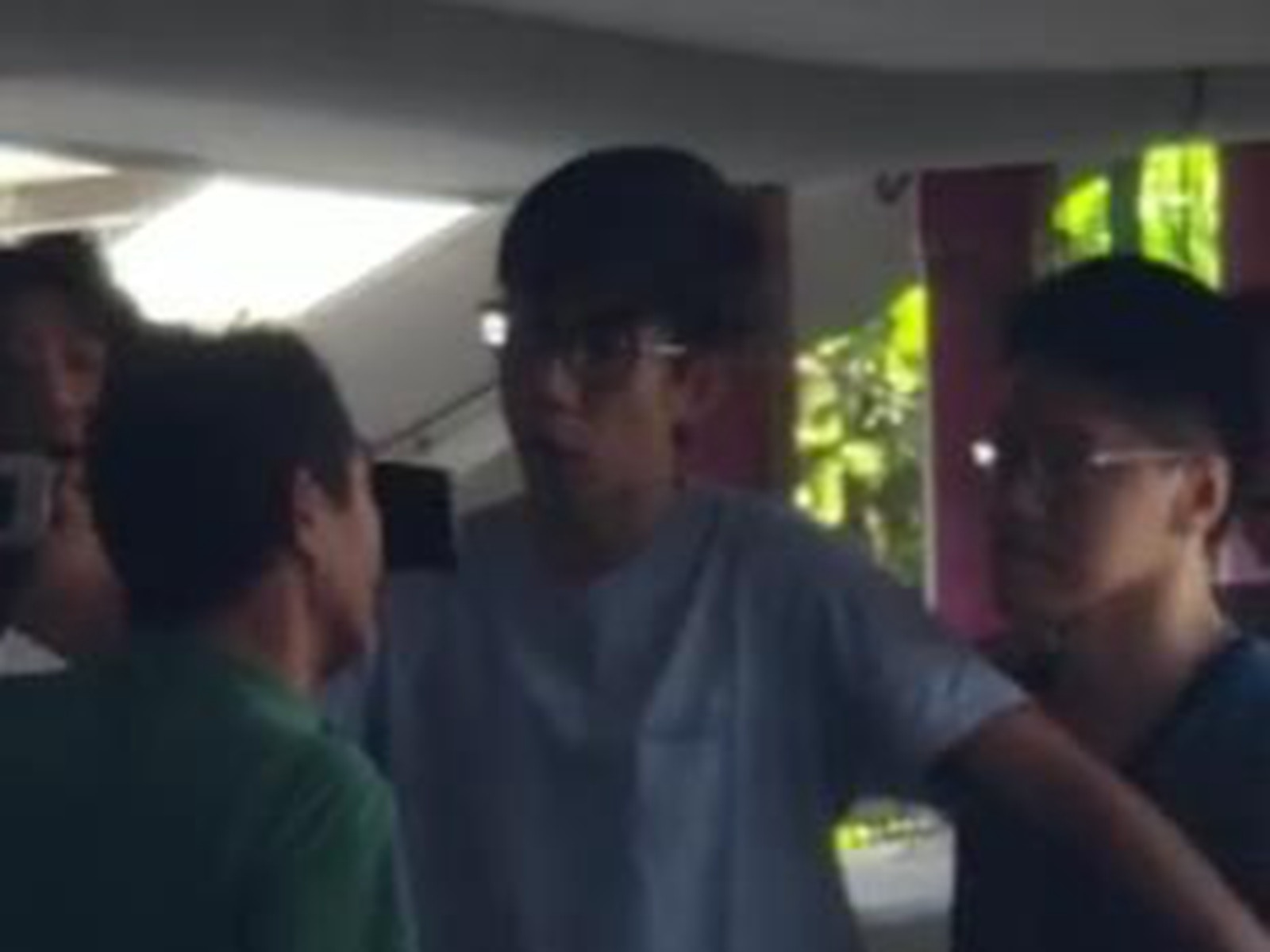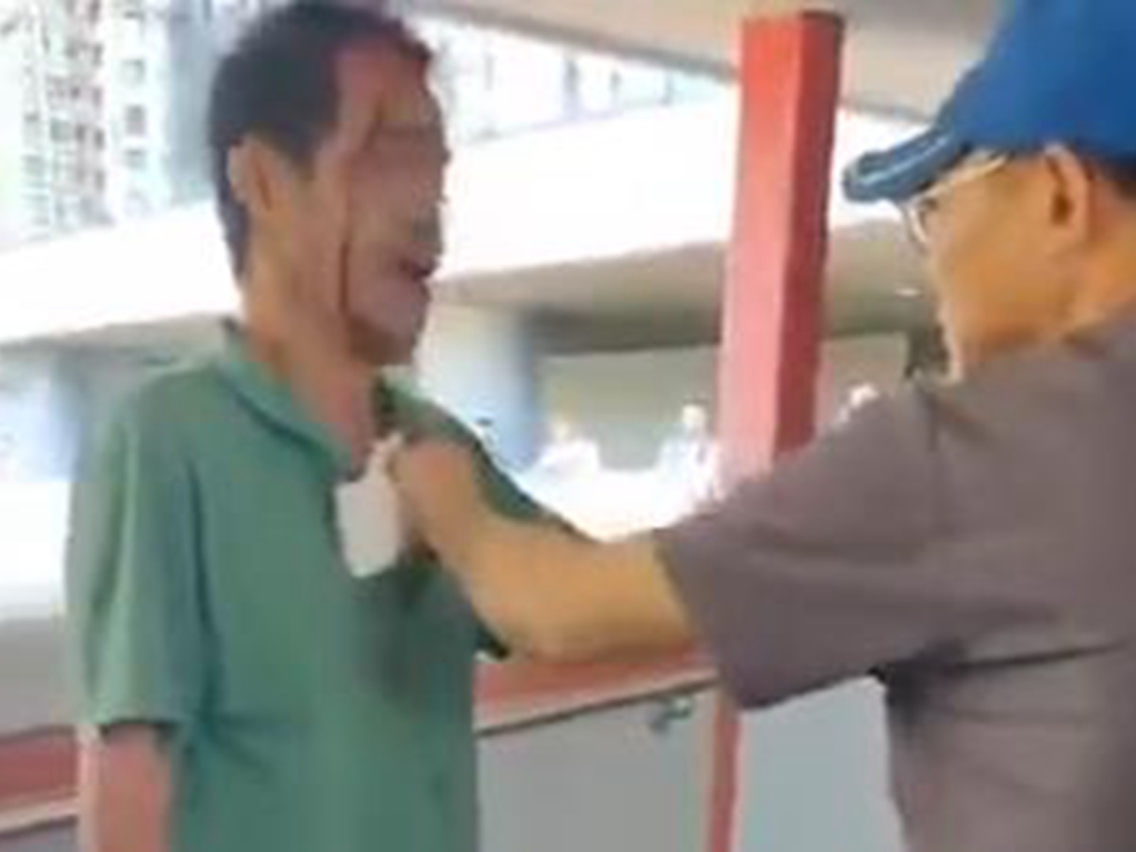 两名年轻男子在与绿衣男子理论。(微博视频截图)
