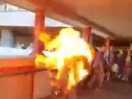 11月11日,在香港马鞍山,一名男子遭人泼易燃液体,并点燃,随即男子全身是火。(微博视频截图)
